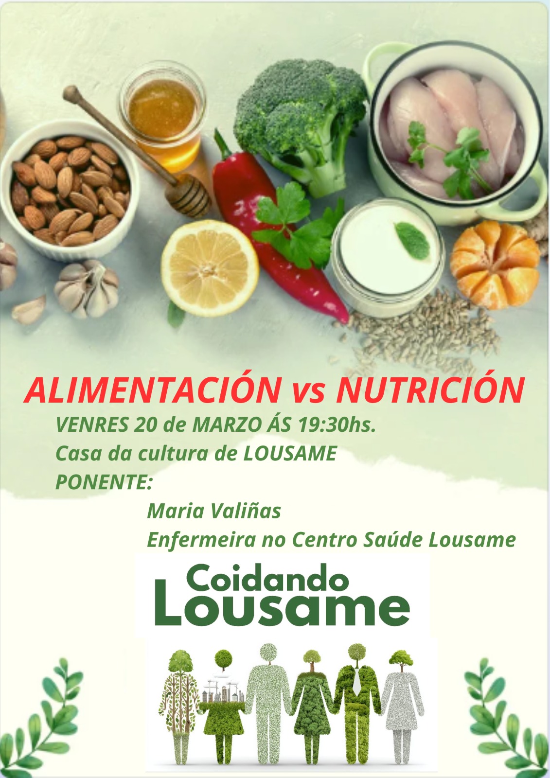 O auditorio da Casa da Cultura Santeiros de Chave acollerá o vindeiro Venres 20 de Marzo ás 19:30 H. a charla “Alimentación e nutrición”, impartida por María Valiñas, enfermeira do centro de saúde de Lousame